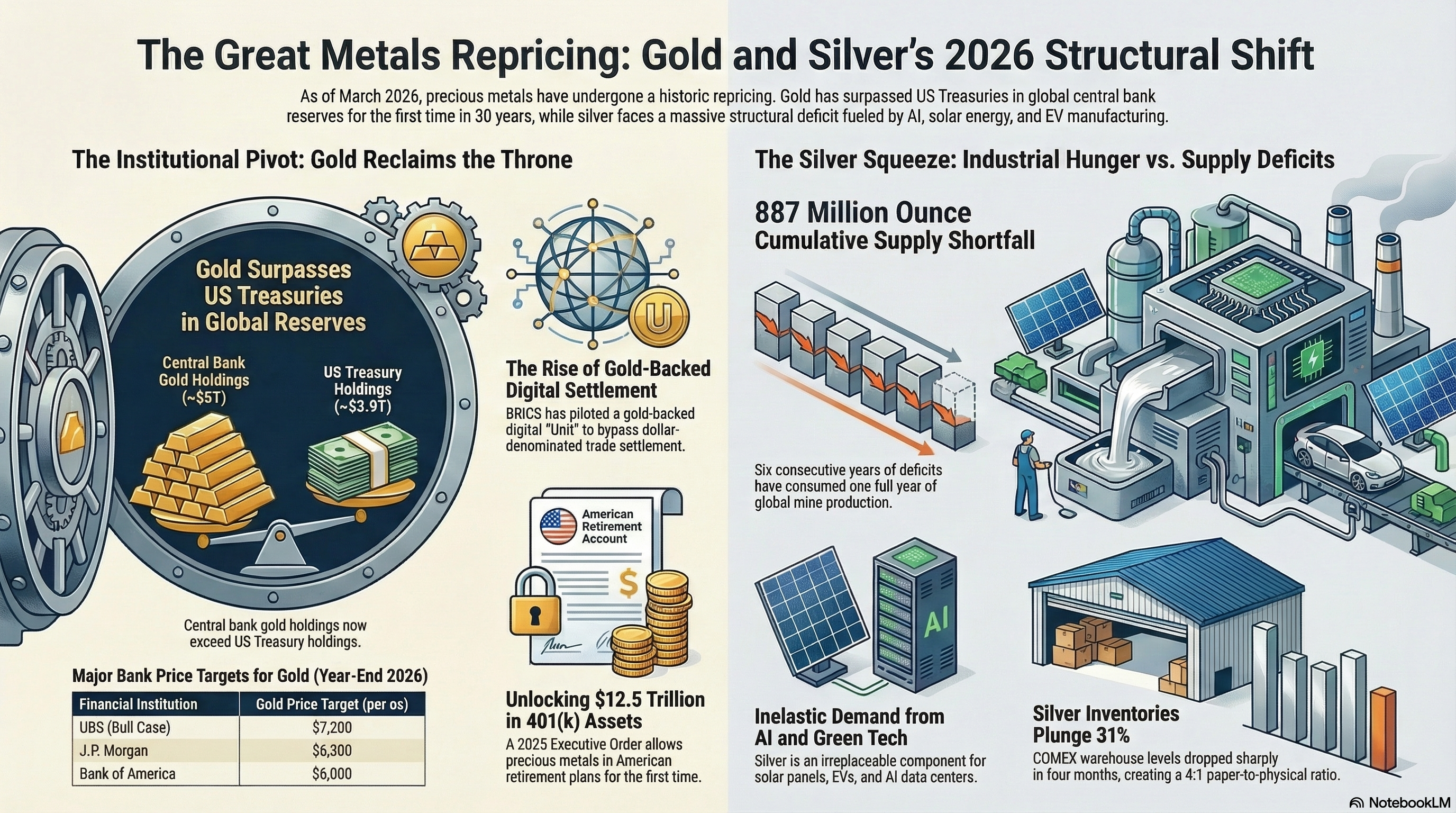 Les institutions qui gèrent littéralement la masse monétaire mondiale ont collectivement décidé qu’un métal physique extrait du sol constituait une réserve de valeur plus fiable que les obligations émises par la plus grande économie mondiale. Au 18 mars, l'or s'établissait à près de 4 906 $ l'once, en hausse d'environ 73 % par rapport à l'année précédente. L'argent s'échangeait autour de 77 $ l'once, en hausse de 128 % sur la même période, et enregistrait son sixième déficit d'approvisionnement annuel consécutif.